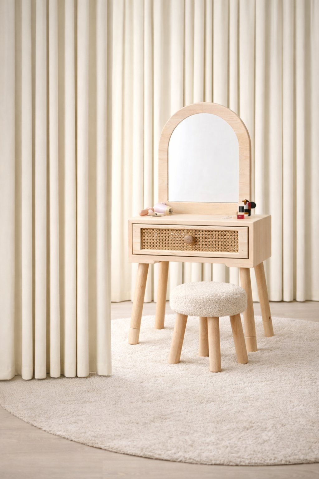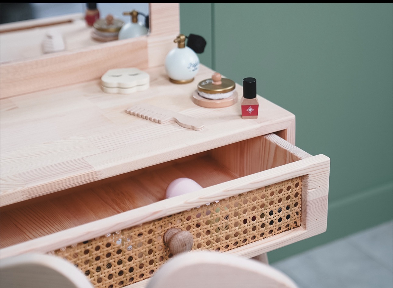 Aura Makyaj Masası; 1. kalite masif çam gövdesi ve doğal rattan çekmece detayı ile tasarlanmış, çocuk odaları için özel üretilmiş dekoratif ve fonksiyonel bir üründür.