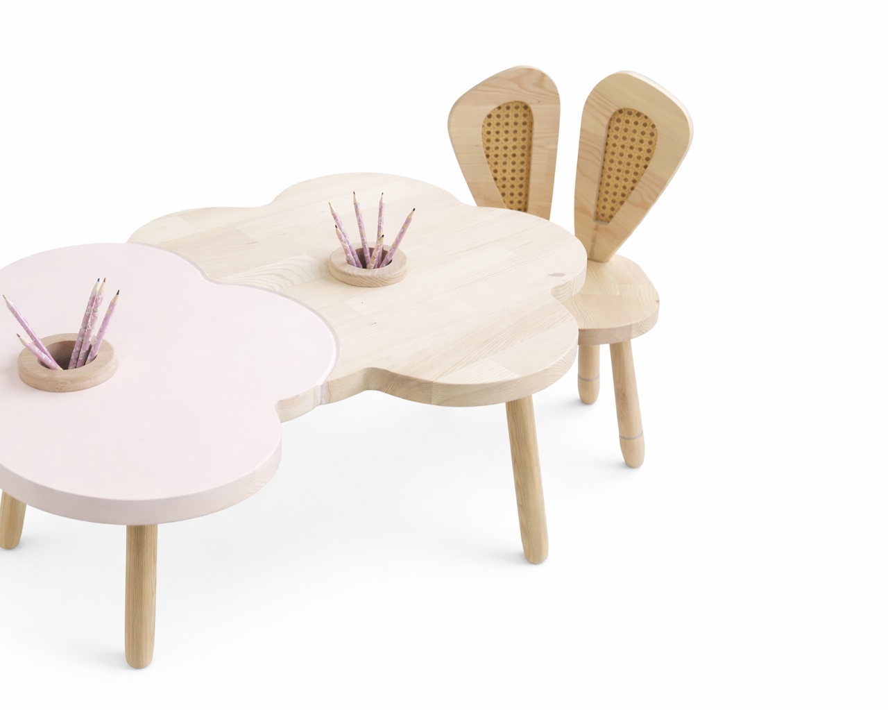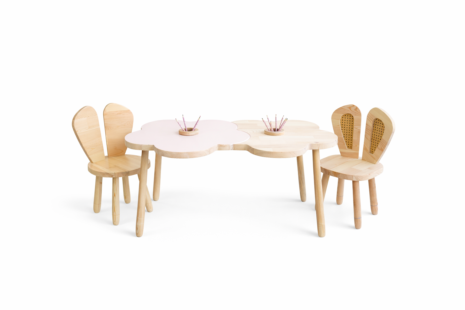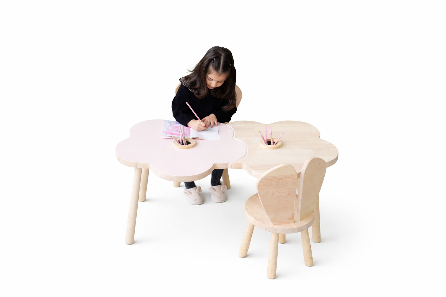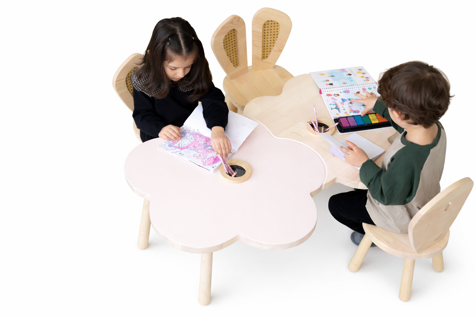 Rain Kids Flora Duo Masa; doğadan ilham alan çiçek formunu çift tabla tasarımıyla birleştirerek çocuklara geniş ve paylaşılabilir bir oyun alanı sunar.