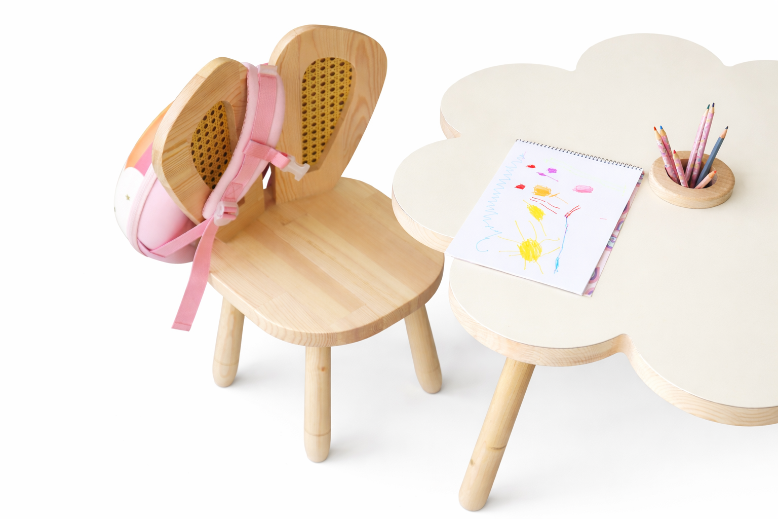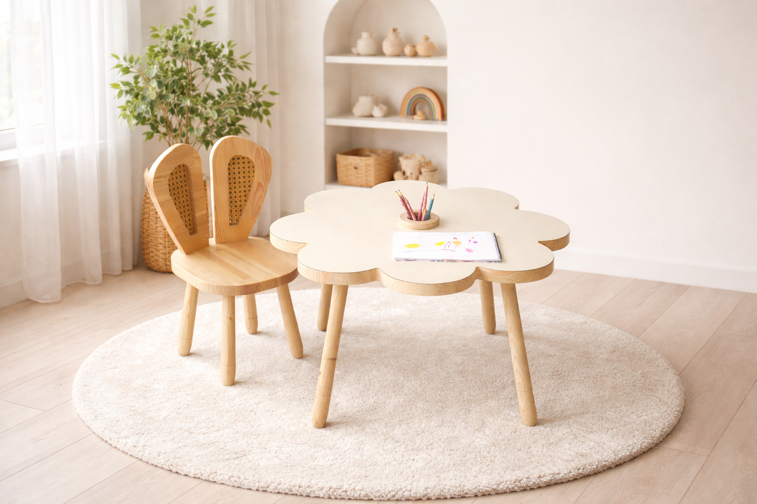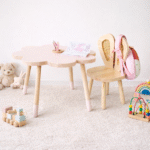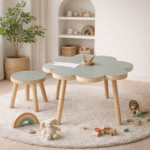 Rain Kids Flora Masa; çiçek formundan ilham alan özgün tasarımıyla çocuk odalarına neşe ve yumuşak bir estetik kazandırır.
