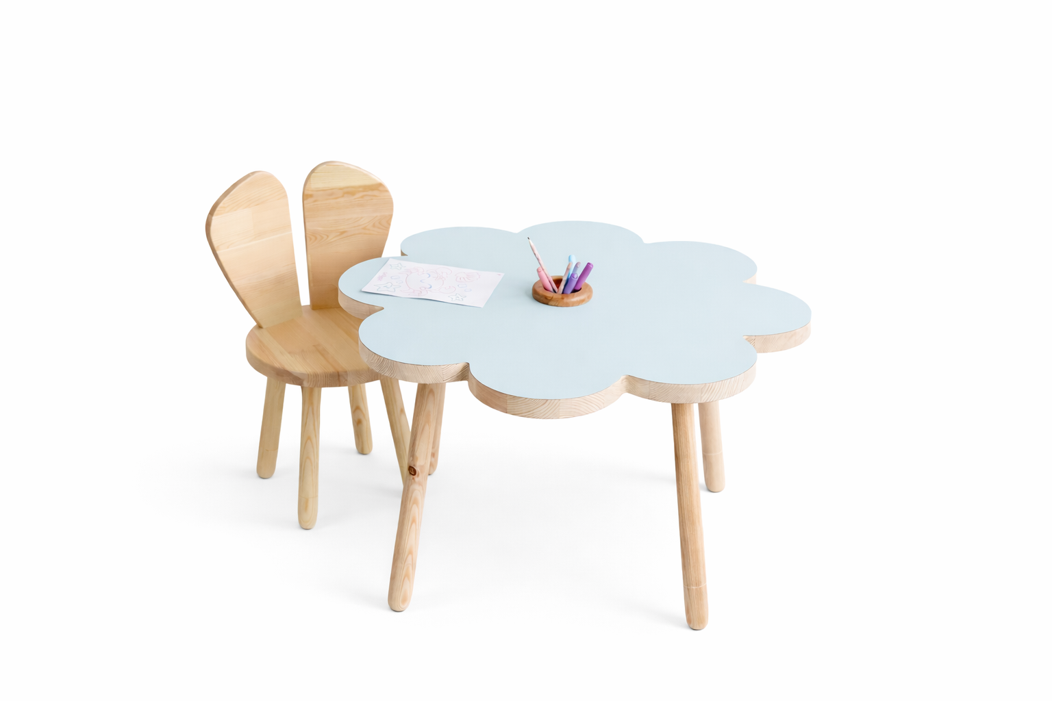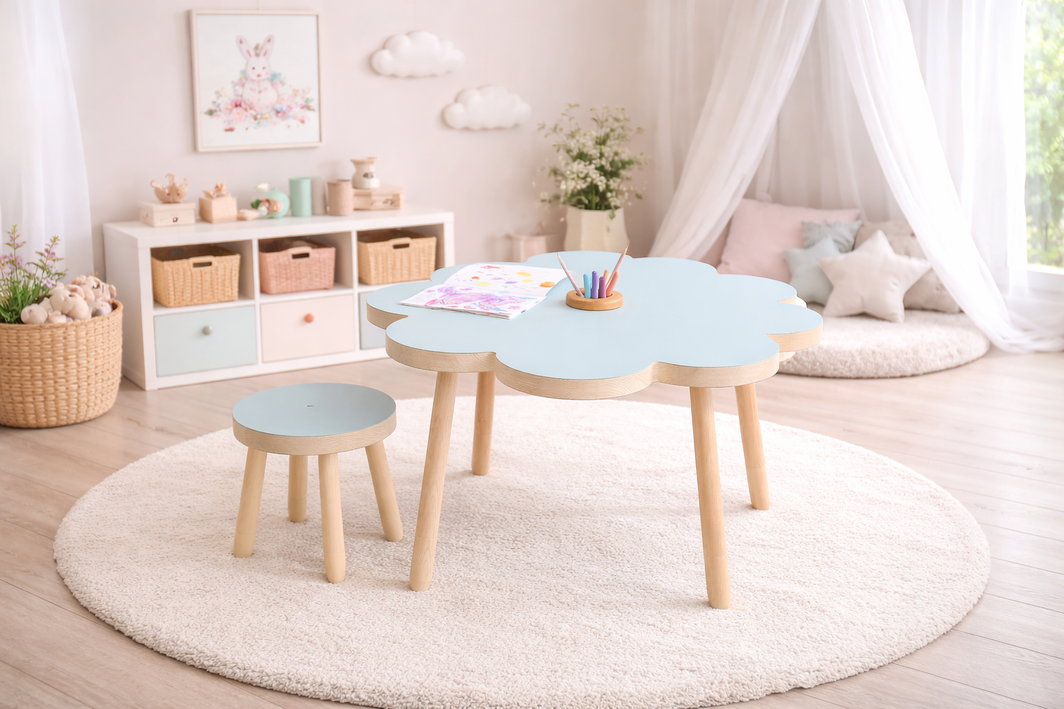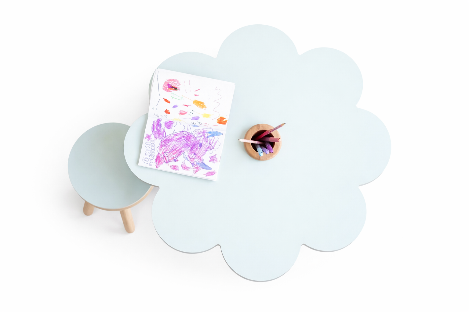 Rain Kids Flora Masa; çiçek formundan ilham alan özgün tasarımıyla çocuk odalarına neşe ve yumuşak bir estetik kazandırır.