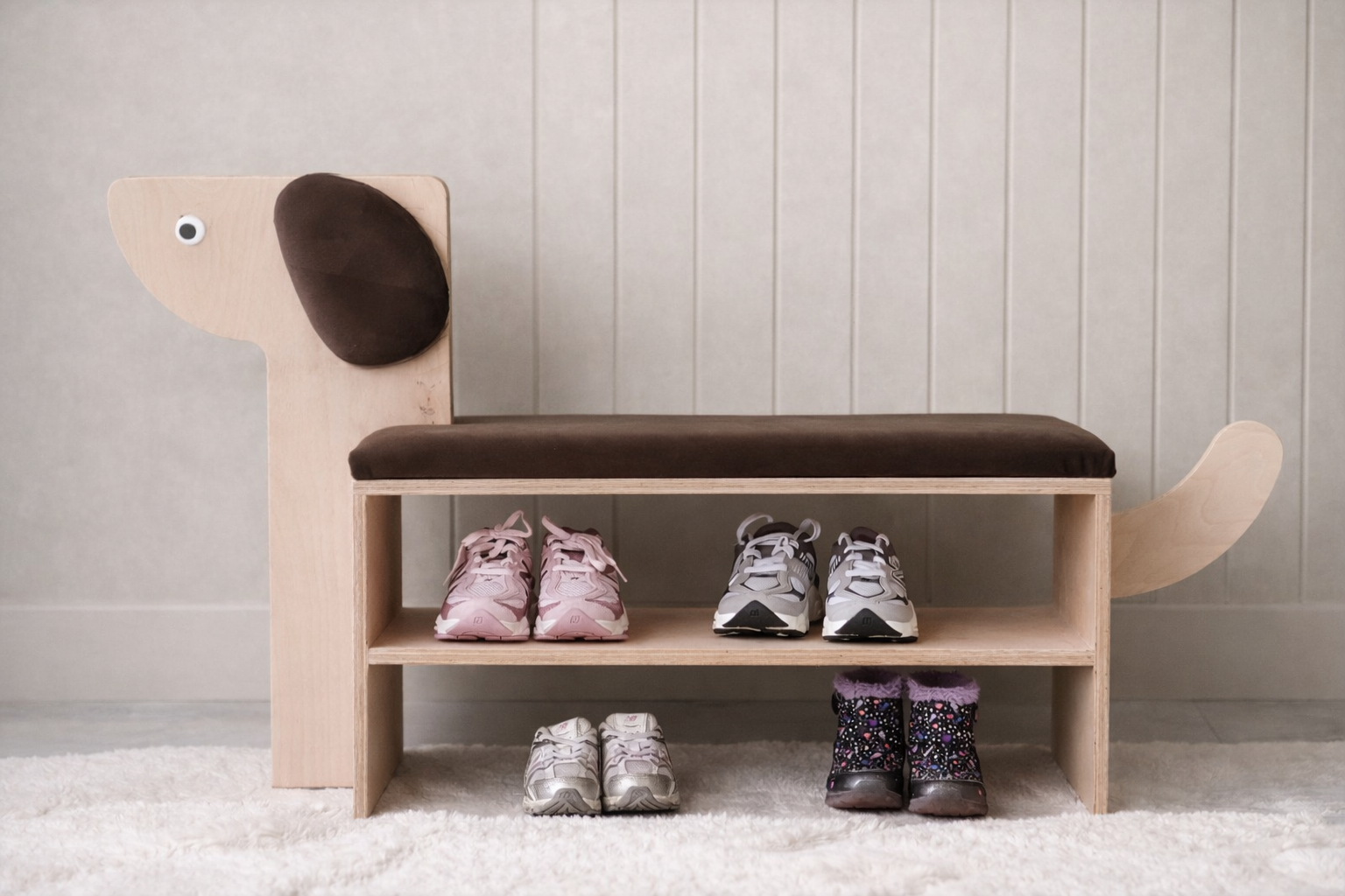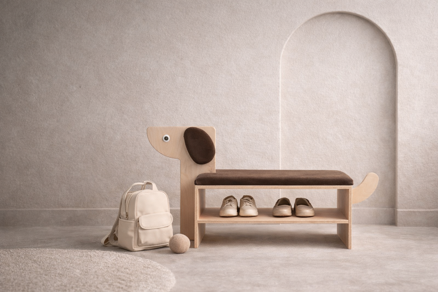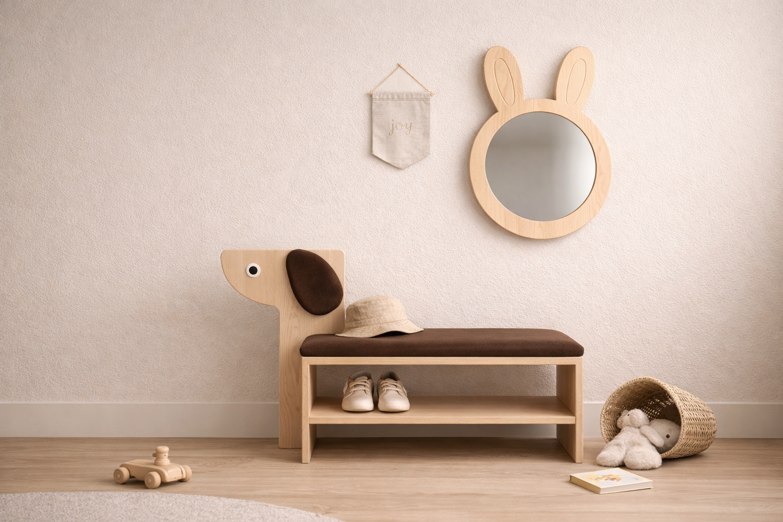 Dogy Bench; 1. kalite kayın gövdesi ve süet dokulu oturum alanı ile tasarlanmış, çocuk odalarına hem fonksiyon hem eğlence katan özel bir Rain Kids ürünüdür.