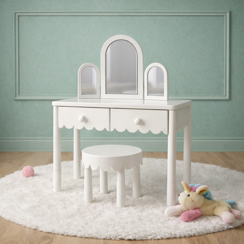Rain Kids tasarımları çocukların hayal dünyasını destekleyen, sade ve zamansız çizgilerle hazırlanır. Aura Vanity Mini, çocuk odalarında hem dekoratif hem de eğlenceli bir köşe oluşturmak için tasarlanmıştır.