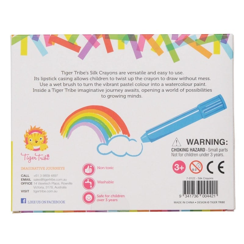 Tiger Tribe 8’li Pastel Boya Kalemi Yaş Grubu: 3 yaş ve üzeri için uygundur. Ürün Özellikleri: Ürün Kutu Ölçüleri: 13,5x17x2 cm 8 boyama kaleminden oluşur. İpeksi Boya Kalemleri, bir mum boya tanımınızı yeniden düşünmenizi sağlayacaktır… Bu bir mum boya mı? Pastel? Ya da sulu boya? İpeksi Boya Kalemleri, pastel gibi pürüzsüz bir şekilde pırıl pırıl devam eder ve görünüşünü değiştirmek için, sadece bir su rengi efekti oluşturmak için boya fırçasıyla su ekleyin. Renkler standart boyalara göre daha canlıdır. İpek boya kalemleri toksik değildir, kokusuzdur ve suda çözünür. Böylece lekeler kolayca yıkanır. Ekstra eğlenceli kısım, her bir boya kalemi bükümlü bir tüple geliyor.